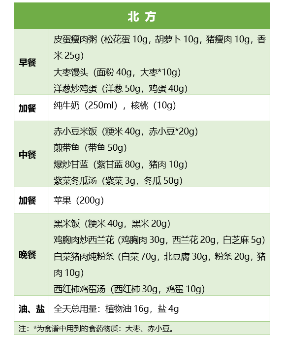以下食譜適合8歲學(xué)齡兒童,提供的能量在1470~1610范圍內(nèi),蛋白質(zhì)57~73g,脂肪占總能量比為23%~30%。其他年齡段兒童青少年需根據(jù)不同年齡段各類食物建議攝入量進(jìn)行適當(dāng)調(diào)整。更多食譜示例見《指南》。
