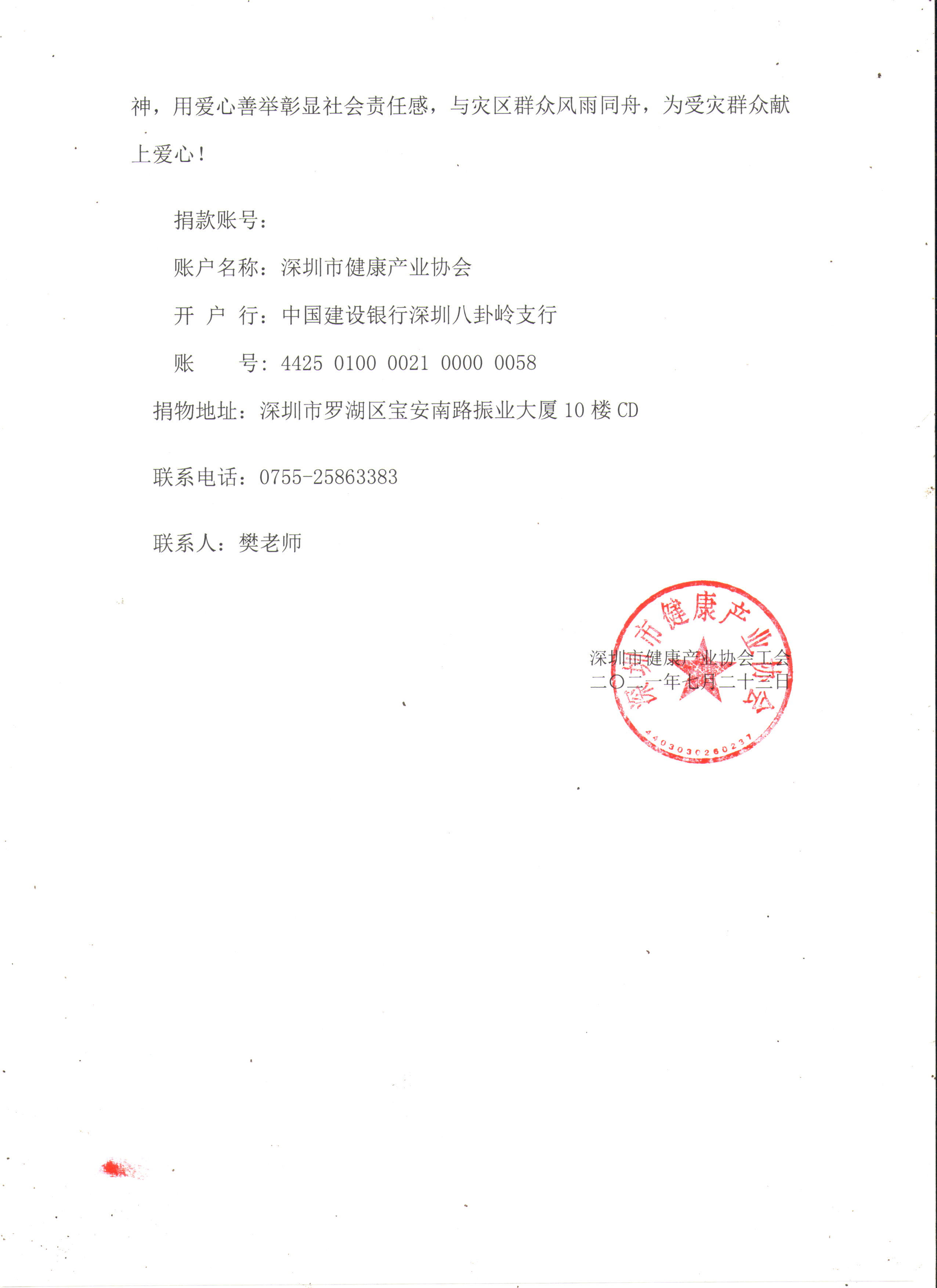 洪水無情人有情,大災(zāi)面前有大愛!為幫助受災(zāi)群眾度過難關(guān)、重建家園,深圳市健康產(chǎn)業(yè)協(xié)會(huì)工會(huì)呼吁全市各單位及社會(huì)愛心人士抗洪救災(zāi)獻(xiàn)愛心募捐,希望各企業(yè)會(huì)員單位和社會(huì)各界愛心人士發(fā)揮先鋒模范作用,用自己實(shí)際行動(dòng)體現(xiàn)先進(jìn)性;希望社會(huì)各界人士發(fā)揚(yáng)友愛精神,用愛心善舉彰顯社會(huì)責(zé)任感,與災(zāi)區(qū)群眾風(fēng)雨同舟,為受災(zāi)群眾獻(xiàn)上愛心!