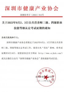 關(guān)于2023年9月2、3日公共營(yíng)養(yǎng)師三級(jí)、四級(jí)職業(yè)技能等級(jí)認(rèn)定考試延期的通知