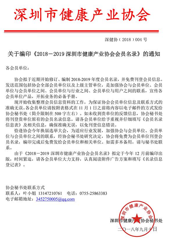 關(guān)于編印《2018-2019深圳市健康產(chǎn)業(yè)協(xié)會會員名錄》的通知